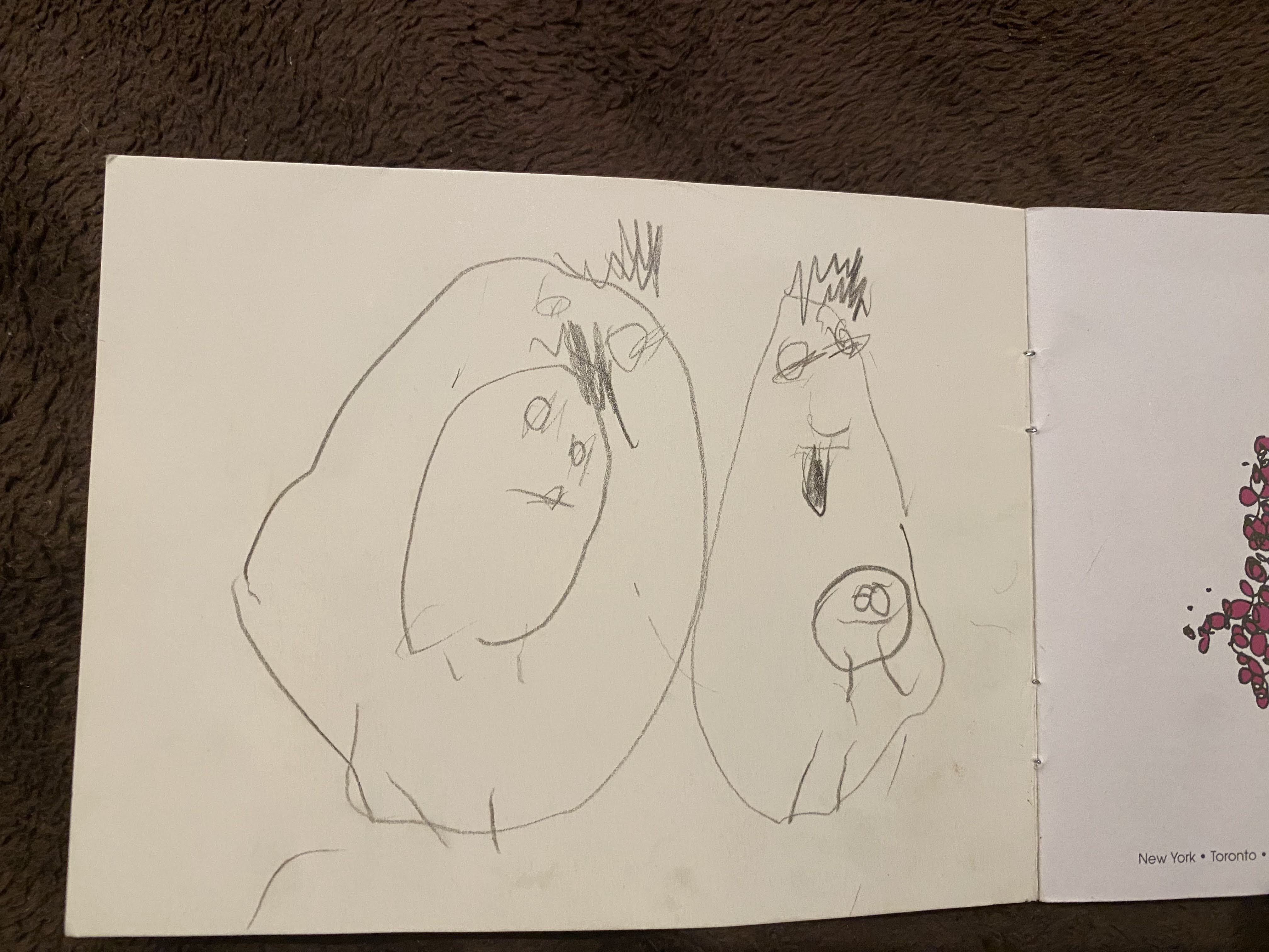 What my 2 year old drew on the other side of the cover page of Dot and Mit(Bob books) while I read βWhat I talk about when I talk about runningβ by Haruki Murakami . She described this as I am in Mommys tummy on the right and my brother is jumping on Papas tummy on the left. Deep!!!