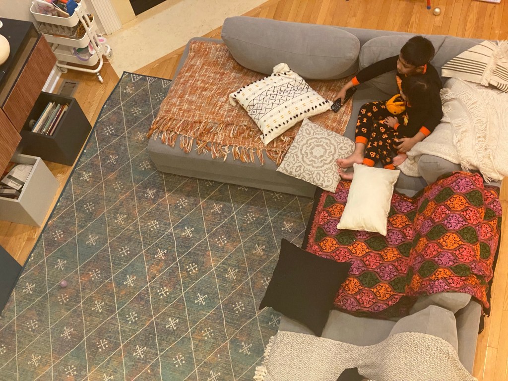 Enjoying TV time after shower. Dinner will be served in a minute. Love how they are totally camouflaged in their matching Halloween PJs. Avyaan has already outgrown it while Aarohi can wear it for another year.
